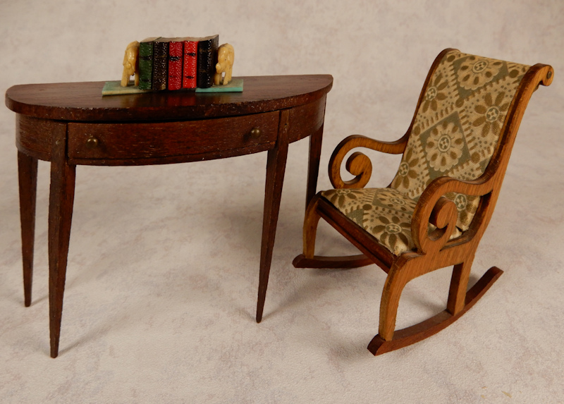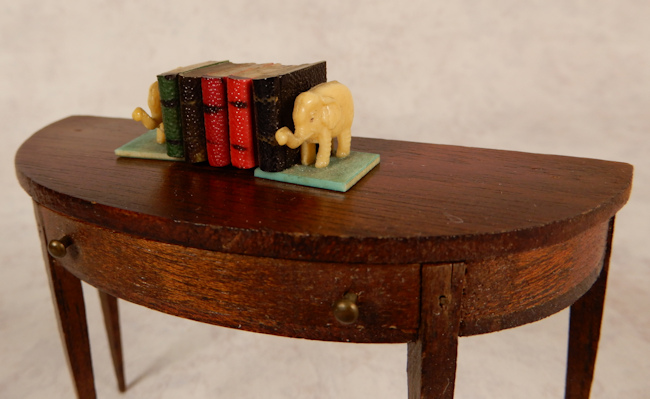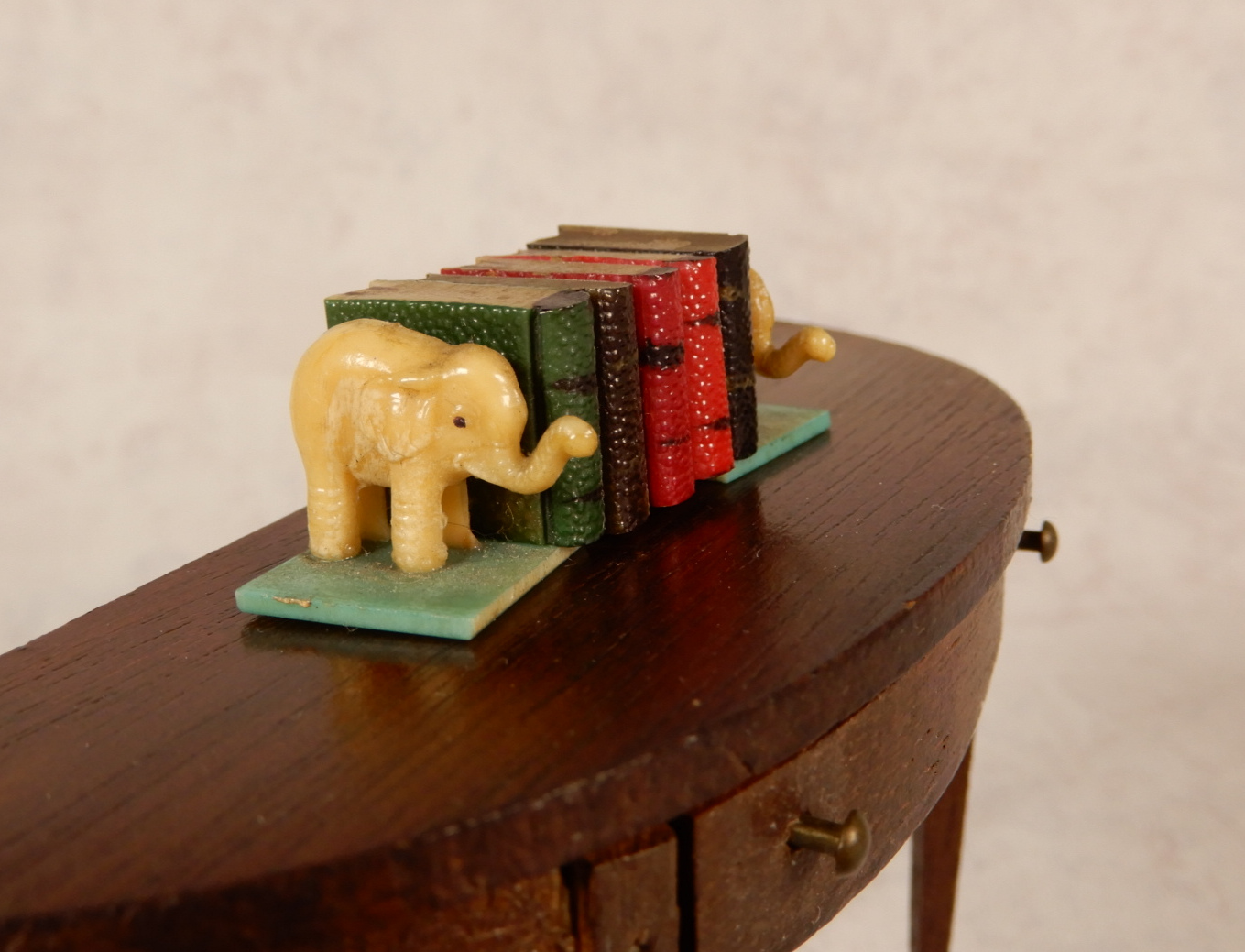 Very unusual Dolly Dear elephant book ends with 5 attached books. This grouping is made from bakelite and celluloid and the books are covered with red, green, and black faux leather. Books are not removable. Darling 1" scale accessory for the dollhouse made in the 1930's or early 1940's. 1/2" high, 1 5/8" long. The elephant theme is quite unusual. Pictured with 1" scale Lynnfield, which are sold separately, for size comparison.