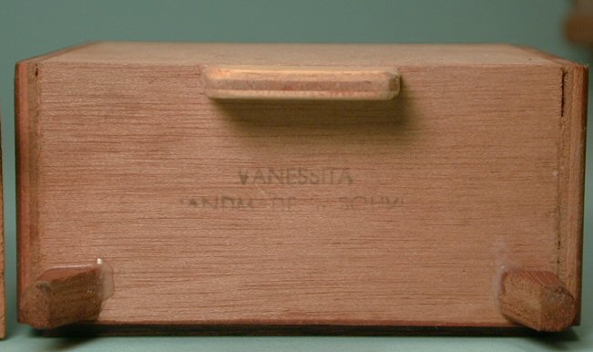 Very unusual matching cabinets in the Moderne style with interesting features. Both pieces are marked on the bottom: Vanessita, Made in Bolivia. The style has a European look to it, so it's a possibility that this set was made by a German expariate. Well made, all wood, some of which looks to be mahogany. Taller cabinet with shelving has 2 movable isinglass doors. Tall shelving cabinet is 4 1/2" high and 3 1/8" wide. Shorter cabinet is 3 1/4" high and 3 3/4" wide. Being sold together as a set. Looks to be from the late 1940's or early 1950's.