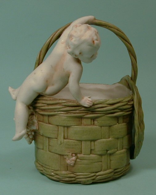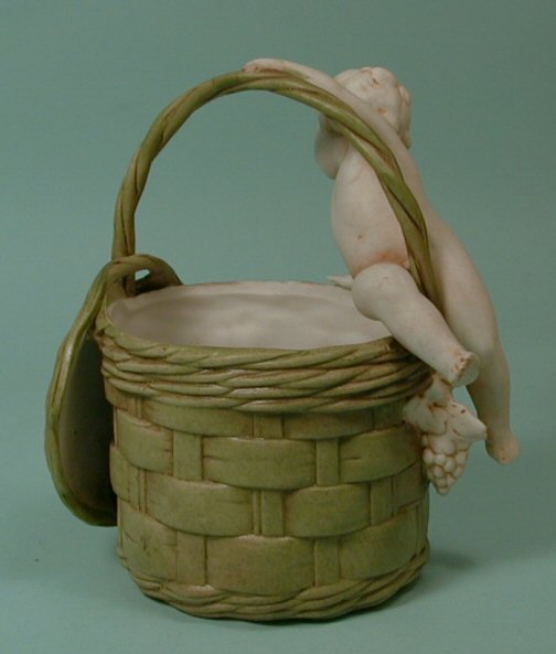 This nicely made baby on a basket was made by the German firm of Hertwig in 1914. An example is pictured in Florence Theriault's book "Hertwig & Co., Archives" on page 32. This example has a colorful green woven basket and the baby or cherub has sepia accents. He sits on the edge of the basket and there are also molded grapes on the exterior. Very finely made and the baby has a sweet face. The model number, also noted in the Theriault book, is penciled on the bottom "3451". Great condition with no breaks, repairs, or hairlines.