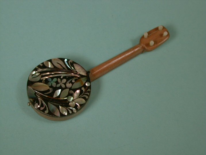 This wonderful early l" scale dollhouse banjo was sold through the Chestnut Hill Studio catalogs during the 1950's. It is all hand made meticulously from wood, with bone and hand inlaid mother-of-pearl in designs of floral and geometric. Superb workmanship for such a tine piece. Incredible detailing. Length is 2 3/5". Great condition.