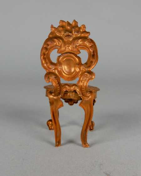 Lovely child size ormolu chair made by the firm of Erhard and Sohne in Germany c. 1900. Beautifully made with much impressed scroll work and lovely patterns. This is the perfect size for a child in a nursery or other parts of the dollhouse where there are children dolls. The chair is 1 3/8" high and 1 1/4" deep. Great condition with no breaks or repairs.