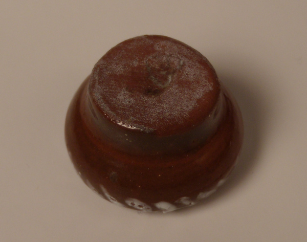 This splendid redware miniature bowl has it all--gorgeous form and a raised white slip arrowheads decoration that goes all around. Great American made redware in miniature and so hard to find. The glazing is a lovely reddish brown. It is completely glazed on the interior. The redware showing on the bottom is pictured. Great Americana and perfect for the early dollhouse collector and collector of American redware. Height is 3/4" and diameter is just about 1". Great condition. Also pictured on a Tynietoy sideboard with a large group of redware and pottery.