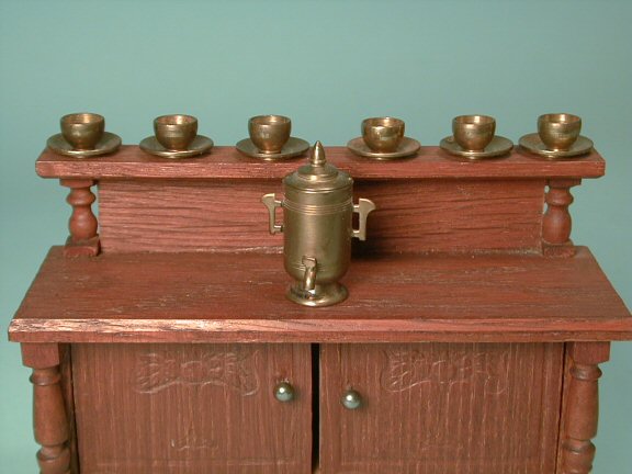 Fantastic and hard-to-find coffee urn set with matching 6 cups and 6 saucers all made from brass. The cover on the urn is removable. Total number of pieces is 14. Beautiful, 1" scale, shown on an early sideboard (sideboard is sold with another lot) for size comparison. Great early patina. c. 1930. Height of coffee urn is 1 5/16" to the tippity top of handle on cover. No markings.