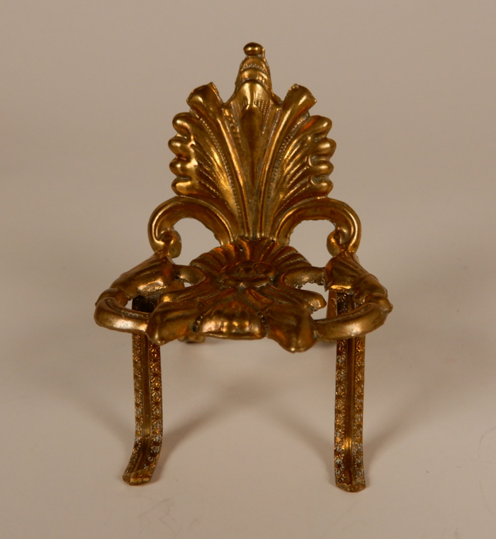 This small ormolu chair is meant for a dollhouse child, in a nursery or other room where a child or toddler doll can sit. Very ornate with lovely designs on the back rests or top of seat, scrolls and flower and interesting leg design. Height of back of the chair is 2" and width of seat is 1 3/8". Nice condition with no breaks or repairs; shows aging. This was made by the German firm of Erhardt and Sohne c. 1910-20 period. These lovely little chairs are difficult to find and would suit a darling little dollhouse toddler.