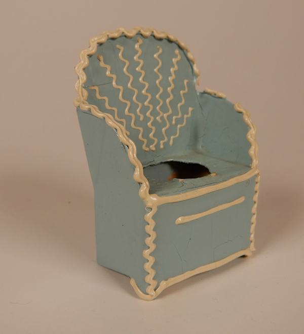 A darling papier mache potty chair made by Dolly Dear, c. 1938-40 era. The base color is a lovely blue and it has the signature thick paint decoration in white which is quite intricate and beautifully done. Height is 2 1/4". The potty is in splendid condition and extremely clean. There is a tiny bit of the white trim missing from the right hand side of the arm, but it almost looks as if it came out of the factory that way as there is no sign of the paint having been there. This is a hard-to-find item. Other examples can be seen in Patty Cooper's book, "Dolly Dear Dollhouse Accessories 1928-1961." The potty chair is also pictured with other Dolly Dear items for size comparison and each is sold separately.