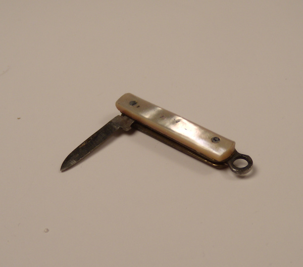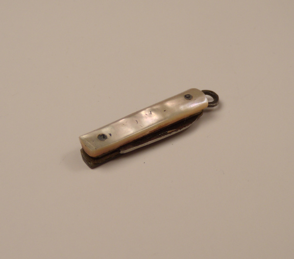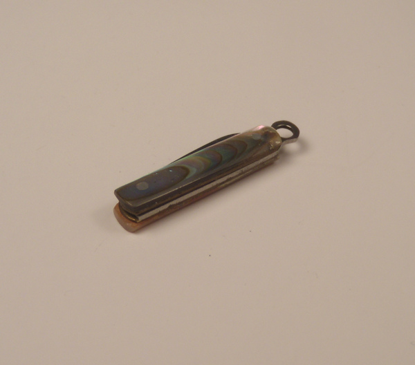 This is a real jackknife that opens and closes and has a sharp edge but in miniature. 1 1/8" long which includes the round end portion with hole. Has mother of pearl handle on both sides, one side is iridescent with lovely coloring and the other side is white mother of pearl. Expertly made and I believe the metal portions to be made from silver as it does show some tarnishing. It even has a tiny slot to insert the fingernail to open and close. Great condition and a very hard to find item.