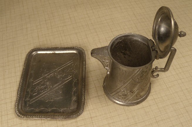 Very early German pitcher with attached cover that opens with a matching tray. Both are nicely executed with pressed pattern of lines, flowers and leaves. The pitcher has a splendid stylized handle which really stands out and makes the piece very elegant. Both are made from a heavy, silvery color metal with substantial weight. The spout has a hole and the cover opens as shown, just like a full-size item. Height of pitcher is 2 3/4" to the tippity top of the cover's decorative tip. The tray is 2 3/8" wide, 3 1/4" long. Made in Germany, c. 1880's. No markings. Great for a larger scale dollhouse or for a setting for a doll. This matching set is being sold together.