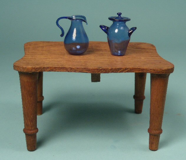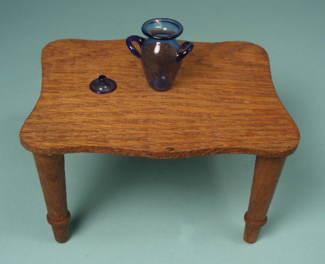 Beautifully executed dollhouse blown glass cobalt blue container with lovely stylized handles and a separate cover. Extremely thin and light, a sign of excellent quality blown glass. 1 1/4" high. Pictured on an American oak table, and also together with a cobalt blue pitcher (both sold separately) for size comparison. Great condition with no chips or repairs. Beautiful striking deep blue color. From the early part of 1900's.