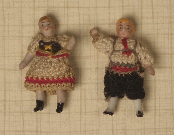 Darling tiny dollhouse boy made in Germany by the firm of Carl Horn, c. 1910. He wears his original crocheted outfit with knickers and tie. All bisque with jointed arms and legs, features are painted. This would be so adorable in a tiny dollhouse or as a doll for a dollhouse girl or in a nursery. He is 1 7/8" high. Also pictured with a Carl Horn girl (sold separately) for size comparison. Great condition with no breaks or repairs.
