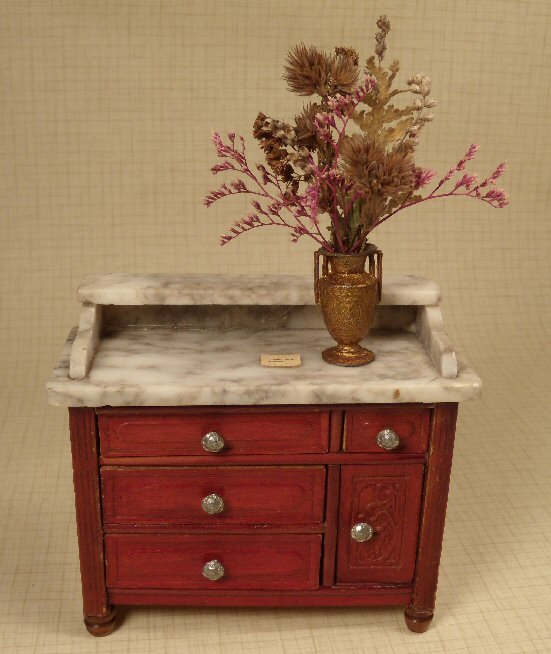 What a lovely accessory for the antique dollhouse. German made by Gerlach, metal painted deep gold vase with 2 side handles. Beautiful arrangement made from dried flowers and plants. Also accompanying the vase of flowers is an early tiny note card representing a faux gift card in perfect proportions. Height of vase alone is 1 1/2"; height with flower arrangement is approximately 3 1/2"; notecard is 7/16" x 3/8. Pictured on a German sideboard which is sold separately. Simply lovely and perfect for the early dollhouse.