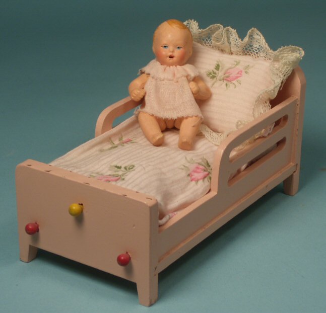 Sweet little German baby, all bisque, and is what is referred to as painted bisque, which has not been fired in, from the 1930's. She has a darling little face with bright blue eyes and an open mouth as if she is baby talking. Hair is painted a short, dark blond with some molded curls in the back. She is marked Germany on the back of the neck. She wears her original little pink dress with matching collar. Her arms and legs are wire jointed. Overall length is 2 7/8". Nice condition...I only detect a few very minor paint rubs on the back of the legs. Pictured on a Strombecker child's bed (bed is not for sale) for size comparison.