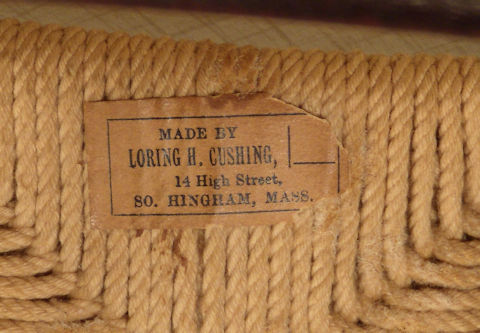 Oh so rare and wonderful Americana, early ladderback chair made in Hingham, Massachusetts, by one of the foremost Hingham craftsmen, Loring Hersey Cushing. And best of all, Loring Cushing's original label is on the bottom of the chair including his address in Hingham. Working during the turn of the century (1900) when Hingham's Arts and Crafts Society was formed, of which he was a member, he had his own workshop at his home creating splendid doll's furniture and this is one of his rare examples. The chair is 9" high, 3 1/4" deep. The rope seating his hand done and the finish of the wood is dark mahogany. Condition is wonderful. If you check my page listed at the top left entitled Articles and News from The Doll Works, you will see a list of articles I had written over 6 years ago for Antique Doll Collector Magazine including a 3-part article of the Hingham Craftsmen one of which featured Loring Hersey Cushing. Examples of this type of chair were illustrated in my article. After my research and articles about the Hingham Craftsmen were published, there was an intensified increase in the interest of collectors about the work of the Hingham Craftsmen. About 2 years ago, the Hingham Craftsmen, including Loring H. Cushing, were featured in an exciting exhibit at Old Sturbridge Village in conjunction with the release of the well-received book, Bucket Town by Derin Bray fully documenting a large number of Hingham Craftsmen--Loring Cushing's work is discussed and illustrated on page 131. Some of our Hingham pieces were featured in both the exhibit and the book. This chair is the perfect size for a cabinet-sized doll or a larger scale dollhouse.