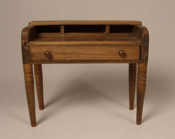 Nicely made dollhouse spinet desk made in the U.S. I believe c. 1970's. All pine wood in a medium pine stain. The drawer has two brass knobs and it opens for holding paperwork. Also has little cubbies. Nicely turned tapering high legs. 1" scale. 3 1/4" high. Great condition.