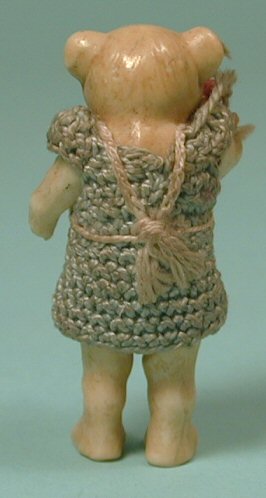 Rarest of the rare!!! All bisque teddy bear with jointed arms and legs with original crocheted clothing consisting of a sweet little dress and apron. She is holding crocheted basket. 2" high and made in Germany c. 1910-15, these darling little humanized bear dolls are highly coveted by collectors and are extremely scarce. Wonderful little expression. Great condition with no breaks or repairs. I can see no markings....clothing covers the entire back.