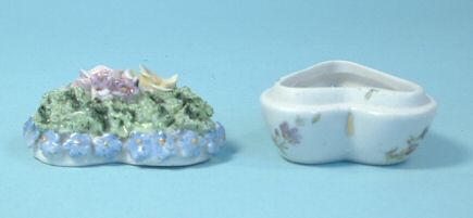 Pictured is an Elfinwear heart shaped, two piece box, made in Germany c. 1910. It has applied moss, edelweiss flowers and roses in a stunning combination of colors. Marked on the bottom, Elfinwear Germany. Very nice condition, but for a few petal nicks. 2 1/4" long