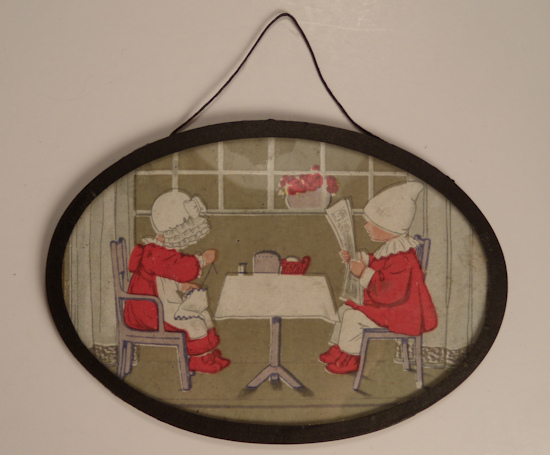 Great looking oval picture ready to hang, made in Germany c. 1920. It depicts two children sitting at a table in front of a window, one reading the newspaper and the other one is sewing. Great early print behind glass with a black frame. The reverse is also shown with an early German price tag. Original stringing is attached for hanging. Lovely condition. Size is 3 3/4" long by 2 1/2" high. There is a little bit of glare at the top of the picture, which happened during the photography. This is a larger picture ready to hang on a large wall of a dollhouse.