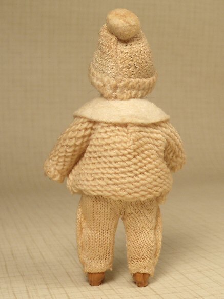 Darling little celluloid toddler boy in the most amazing factory-made outfit. He wears a knit sweater with felt collar and a matching knit hat, but the best part is the little jodhpurs with each side accented with with 3 tiny glass beads, so realistic that there is a thread running under his shoes' soles, just like real jodhpurs have straps to hold them down. He is all celluoid with a sweet character face, mohair wig and molded brown shoes. Jointed at arms and legs. 3 1/2" high. I was able to make him stand on his own, that is how nicely balanced he is and so well made. Made in Germany, c. 1910-15 era. Great condition. This little fellow would make a great addition to your dolllhouse.