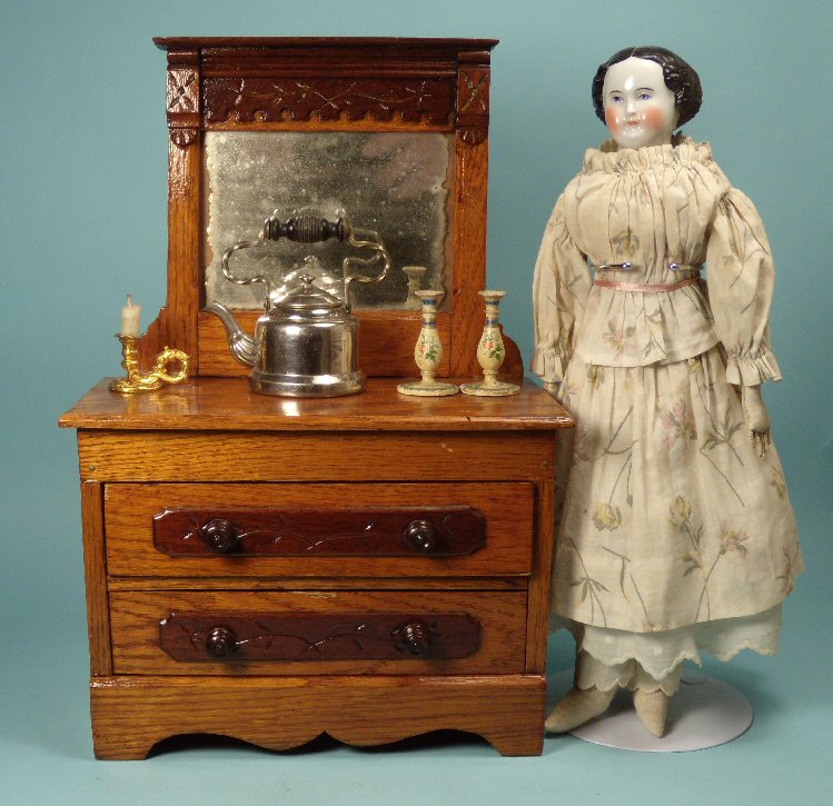 This is, by far, one of the loveliest German treenware items I have ever come across. Wooden pair of candlesticks, hand painted with red strawberries, green leaves and vines and accented with blue and gold stripes over a background of lovely cream color. Beautifully made and extremely rare, the strawberries design is one of the most desirable patterns in treenware. Height is 2". An example of this item is pictured in Swantje Koelher's Christian Hacker book on page 314. Also pictured on a 13" high American dresser with a 13" high china head lady for size comparison and to show how lovely they all look together--all items are sold separately. This is a very rare and wonderful set of treenware candlesticks.