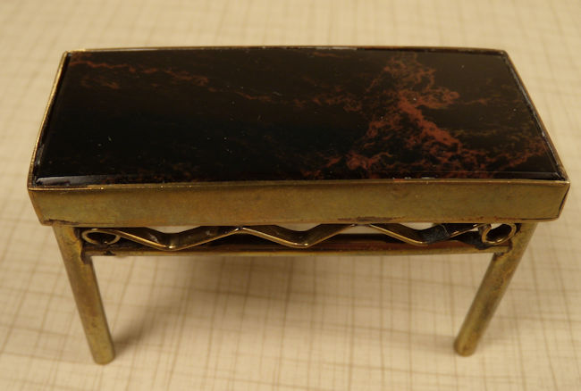 | Description: Lovely side table for the dollhouse, made from heavy, solid brass with a real marble inlaid top.  Beautiful hand-crafted workmanship, especially on the two sides.  Signed on the underside, Mexico and the artist's logo which looks like a flower.  c. 1960.  The brass has some tarnishing, but this is beautiful aging and not a distraction.  The marble top is shiny black with rust swirls.  1 3/4" high, 2 5/8" long.