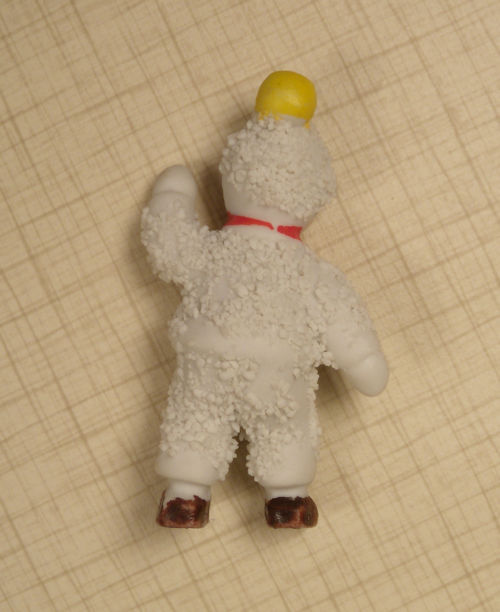 Very unusual German snow baby with hat and large yellow pom pom. He has an 0 shaped mouth, round face with a raised nose. Red collar. One hand is raised and the other is down. 2 3/4" high. Nice condition with no breaks or repairs. Some grout missing as shown in the photos. Needs a little sticky wax to stand.