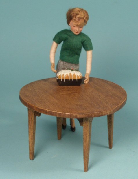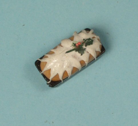 Beautifully made cake in a pan dripping with white icing topped by a sprig of holy. Would look great on a Christmas table in the dining room of a dollhouse or any place to bring a little festive atmosphere into the doll house. Pan is metal and the cake looks to be composition. Very realistic and attractive. I believe this to be from the 1960's. 1" long, overall height is 3/4". Also pictured with a Caco lady doll and table (doll and table are not for sale) for size comparison.