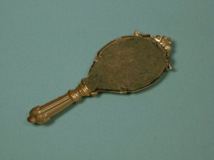 Oh so rare and so fantastic. Doll's hand mirror from c. 1875 made from ormolu in fancy scrolled design pattern. Original mirror (with some loss of silvering), backed by the original, early cardboard. Length approximately 2 1/2" perfect for the fashion doll or lady doll of the 1800's. Also would be great for the larger scale dollhouse.