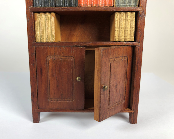 Lynnfield bookcase with two doors at the bottom with impressed panels on the doors, which open, made c. 1940. This particular bookcase was made only for a short period before and the beginning of World War II. High quality, solid mahogany, with a nicely made broken pedestal at the top with ball decoration. Great finish in a deep reddish mahogany. Great workmanship with dado construction of the shelves which are inserted into the sides, a feature of earlier Lynnfield. One inch scale, 6 1/2" high to top of pedestal. Many colorful faux books, made from wood with spines covered with imprinted paper. Some of the book groupings are removable and some are permanently attached. Great condition with no breaks or repairs.