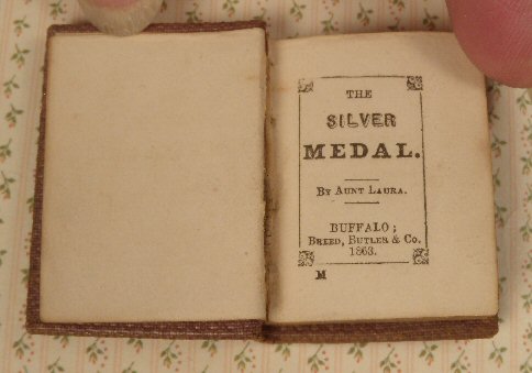 Beautiful leather bound book, cover is embossed with some gold gilt decoration and edges of pages gold gilt. The Silver Medal was written by Aunt Laura whose name was Frances Elizabeth Barrow and published by Breed, Butler & Co., in Buffalo in 1863, as written on the title page. The complete book has 64 pages and tells a story of a young girl and how she desired to win a Silver Medal award. Very nice condition. Size is 1 3/16" wide by 1 5/8" high. These early miniature books are so difficult to find. Perfect for the early dollhouse.