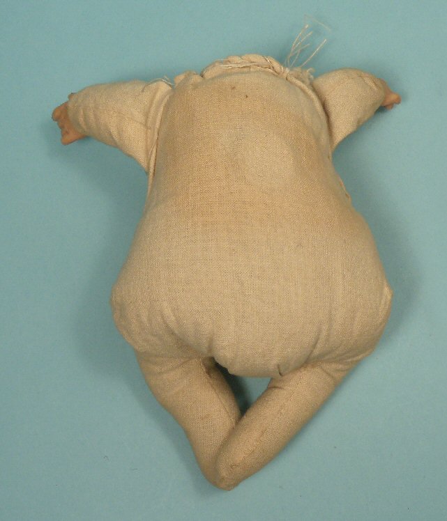 I believe that this is the smallest cloth body made for the German bisque headed Bye Lo. This tiny body is extremely rare and so difficult to find. The overall length from the tip of the toe to the top of the neck is 5 1/2". I believe this Bye Lo body would make a 6 1/2" to 7" doll. This body is very clearly marked: Bye-Lo-Baby, Pat. Appl'd For, Grace Storey Putnam. The tiny celluloid hands are in perfect condition. The original cardboard to hold in the stuffing is still there. This frog shaped tiny body is so rare and quite early, c. 1920, as Grace Putnam had not even received the patent yet, but had only applied for it as stated in the mark. This original cloth body was made for the German bisque Bye Lo baby and is in very nice condition.