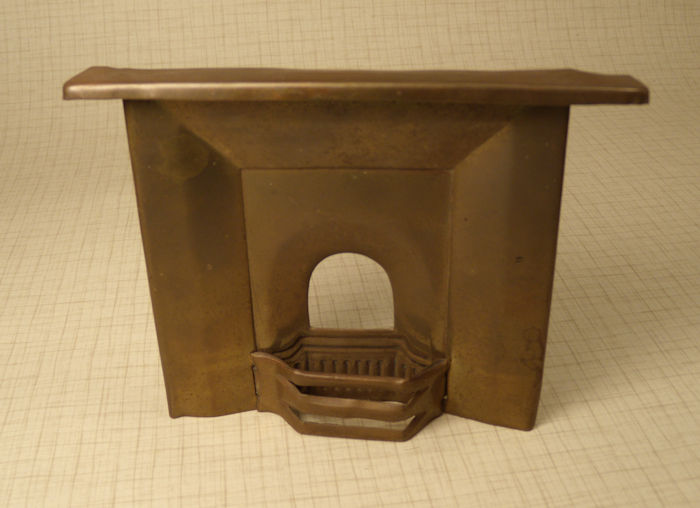Very interesting and unusual brass fireplace that has an attached coal fender. Age is c. 1890-1900, 1" scale: 4" high, 4" wide at base and 5" wide at mantel. Wonderful, early patina...I have not polished it, but left the early patina as it is. All brass, possibly English made. I have not seem one like this before. Very nice condition with no breaks, shows a few very minor dents, commensurate with its age.