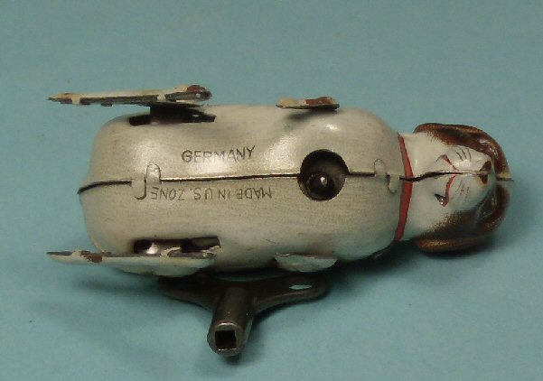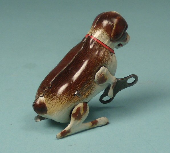 Cute little tin wind-up dog, made in Germany c. 1948. When would, the dog jumps up and down. Very good working order. Key is removable. Painted white and brown with a red collar. Nice condition. Marked: Germany U.S. Zone as shown. 2" high to the top of his head.
