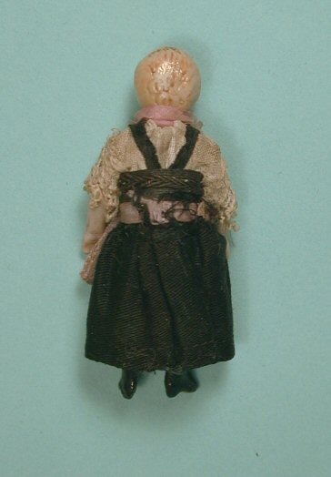 This petite young lady was made in Germany c. 1890 and is made from all bisque, jointed at the arms and legs. She wears her original clothing of a long black skirt with white lace edged blouse. She has molded blond hair and her facial features are delicately hand painted. Her black painted boots have tiny heals with brown soles. Very nice condition with no breaks or repairs. The pink ribbon around her waiste has some wear and aging. She is 2 1/2" tall and meant for a small dollhouse.