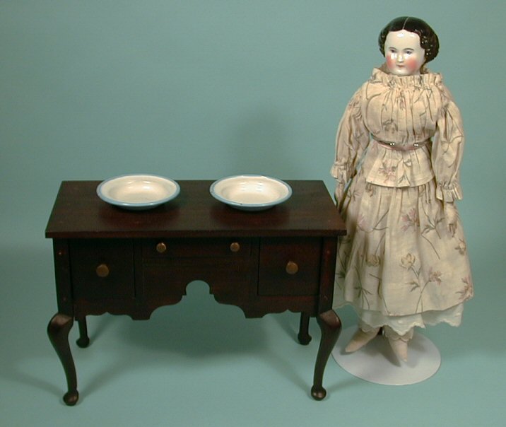This set of matching granite ware plates are being sold as a set. They exhibit a lovely color combination of white interior with light blue edging which continues on the reverse side--front and back are pictured. The set is also shown in a setting of a china doll and early Loring Cushing sideboard (other items are being sold separately) for size comparison. Each plate is 2 3/4" diameter. Very nice condition with minor wear. No markings but made in Germany c. 1915.