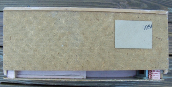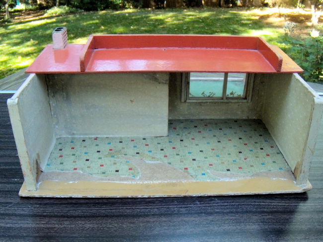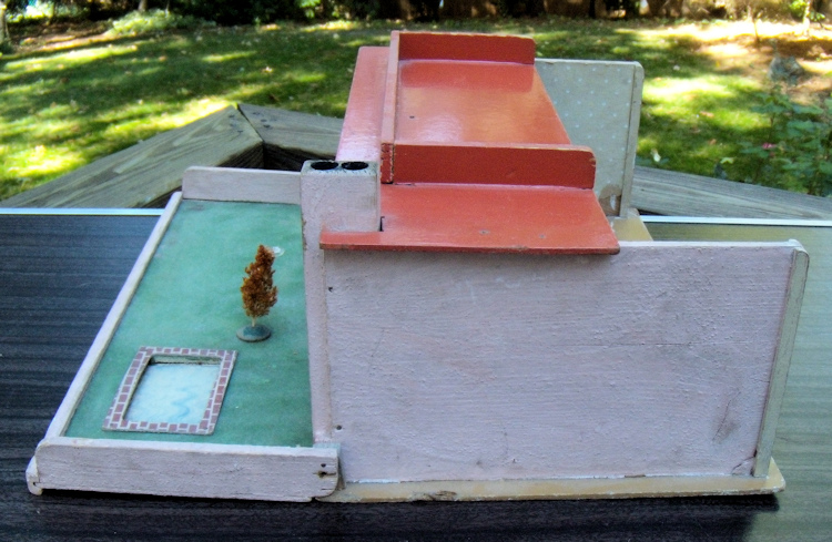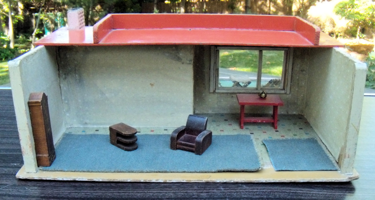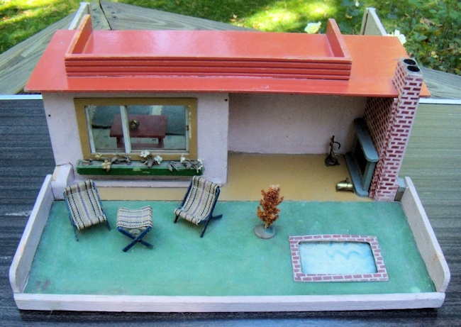 Ah, so rare mid-century Modern Gottschalk petite dollhouse with super-rare garden and swimming pool! Made in Germany during the 1950's. Marked with a 4 digit number underneath which is number 105? and shown in one of the photos. The garden has a green flocked surface with the addition of a swimming pool or garden pond. The surface of the water is papier mache painted like water and surrounded by papier mache painted bricks. It also has a tree, which is removable, in the center with a base having a hole where the tree is inserted. The large glass picture window has a long flowerbox with its original flowers and opposite on the side wall is an outdoor fireplace, which is painted gray and has painted brick on the wall and the chimney poking above the flat roof. The exterior of the house and side garden walls are painted a very pale pink while the roof is red, just like many Red Roof Gottschalk dollhouses. The flat roof also has a walled section and I have seen some of these with more patio furniture, similar to a rooftop patio. The interior has the modern open floor plan which can be furnished in different sections. The step back area has a large picture glass window which actually opens by the handle. All walls have the original wallpaper which is beige with white dots. The floor is papered with a modern design which look to represent square marble tiles with multiple bright colored small tiles interspersed, which include red, green, blue, purple and beige. Those portions of the floor which are not papered (tile) or green flocked (grass) have been painted a nice dark beige. The house includes all the furnishings that are shown, which are: interior--modern chair and side table, clock, red library table, and tiny brass teapot with cover and two pieces of dark moss green carpeting; exterior--matching 3-piece metal and striped canvas outdoor furniture and brass fireplace equipment with log holder. The dollhouse is all original with original paint and papers, albeit, there is some wear and aging. The paper flooring on the interior has some sections that are missing, but these are nicely covered up with the larger carpet. The wallpaper also has a few issues. but again these can be disguised with furniture. The garden area folds up by hinges on the side. Size is 17 1/2" deep with garden open, 18" wide, and approximately 7 1/8" high. The materials of the house are wood, papier mache, flocking and paper. These Gottschalk mid-century houses are so difficult to find. Research has been done by Swantje Kohler and Rebecca Green on these hard-to-find dollhouses. The purchaser would need to keep in mind that there would also be shipping and insurance costs.