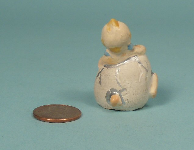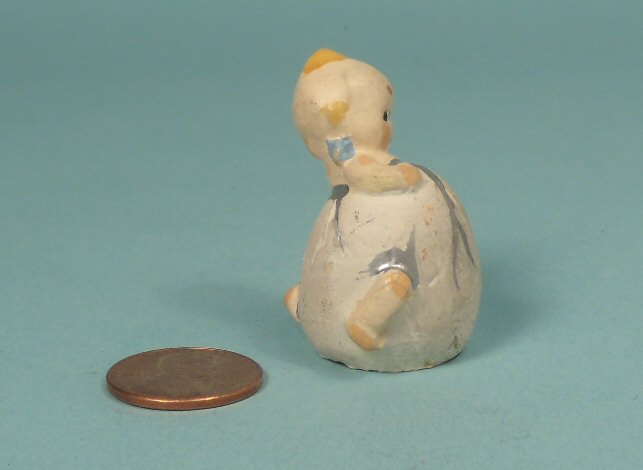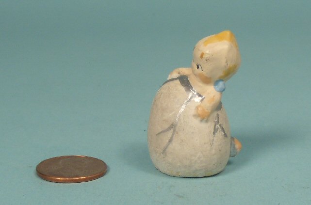 An extremely rare tiny Kewpie breaking out of an egg with his little legs also poking out at different angles. Made in Germany from excellent German composition, 1 5/8" high. c. 1915. This is a really rare model and one I have not come across before. Darling little smiling face with eyes looking to the side, with the blue Kewpie wings. The cracking of the egg is indicated by silver lines. Composition is in really nice condition. There are no markings. This is truly a great, very rare piece, perfect for the Kewpie collector. This same piece, Kewpie with Egg, in bisque is valued in the thousands of dollars. When looking at the pictures, one must remember that the Kewpie in egg is greatly magnified--magnifying every tiny speck and dust particle...in person, those things cannot be seen.