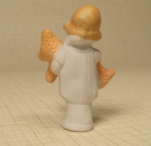 What a darling little girl standing holding her over-sized teddy bear. She was made by the Hertwig firm in Germany c. 1920; faintly marked Germany on the back. The figure is all one piece and nicely finished bisque with colorful striped dress and red shoes with the teddy bear enameled in light brown. Overall height is 2". Great condition with no breaks or repairs.