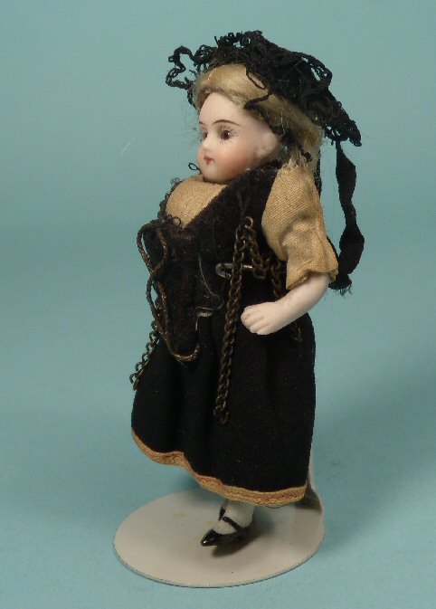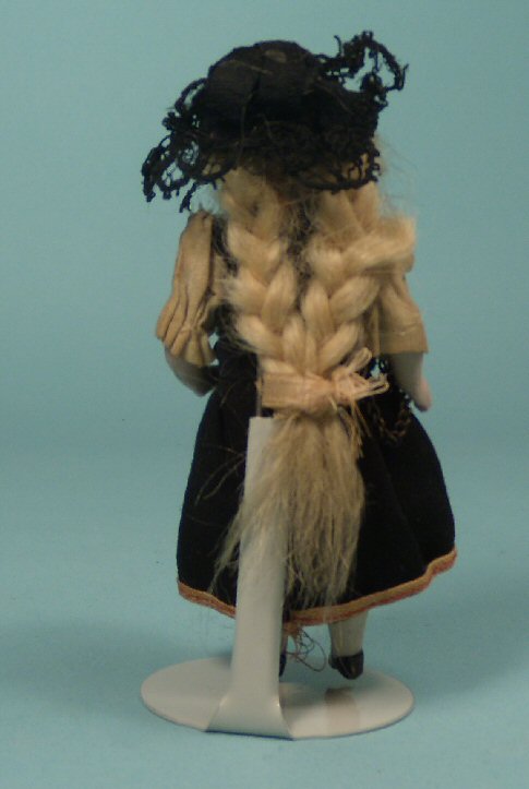 What a great looking young lady with the most fabulous all original outfit made from lace, velvet, batiste and wool accented by gold metalic braiding and metal decoration. Her original blond mohair is braided in the iconic hair style of the 1880's for young ladies. Stationary glass eyes, jointed at shoulders and hips. Molded one-strap black painted shoes with beige soles and high white stockings with blue bands, which are Kestner signatures. Hat is velvet covered with lace and long dangling ribbons on back, which have been pushed aside so that the fabulous braids in the back can be seen. c. 1880, made by Kestner in Germany. 3 7/8" high. Hard to find, lovely little doll. Underskirt is a contrasting rust color with white long underwear edged in lace....all original.
