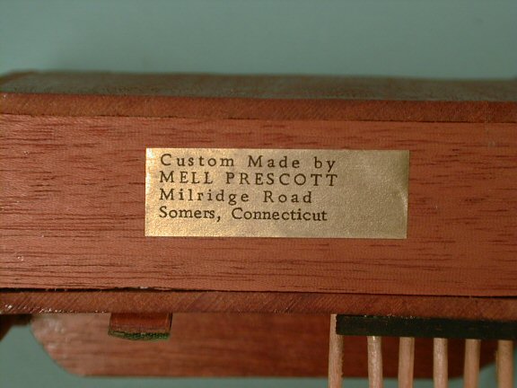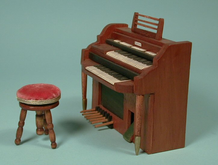 Pictured is the "Baldwin" organ and matching stool by the Connecticut miniaturist, Mell Prescott. Made from mahogany wood, the white keys are drawn in while the black keys are raised. The matching stool has rose colored velvet upholstered seat trimmed with gold cording. Very well executed. Legs have brass tips. It has a printed label "Baldwin". Gold label on the bottom says, "Custom Made by Mell Prescott," and her address. This is her early work from the 1960's. Height is 3 5/8" to top of music stand and 4" long. Very nice condition with no breaks or repairs.