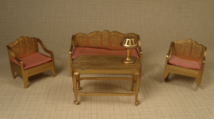 Very nicely made Tootsietoy 5 piece living room set, in 3/4" scale. Gold enameled with pink upholstery, very striking and well made. The set includes a sofa, chair, table, rocking chair and matching table lamp. The gold enameling is in beautiful condition. The upholstery has some aging. Height of sofa is 2", and table is 1 3/4". Marked Tootsietoy. c. 1930