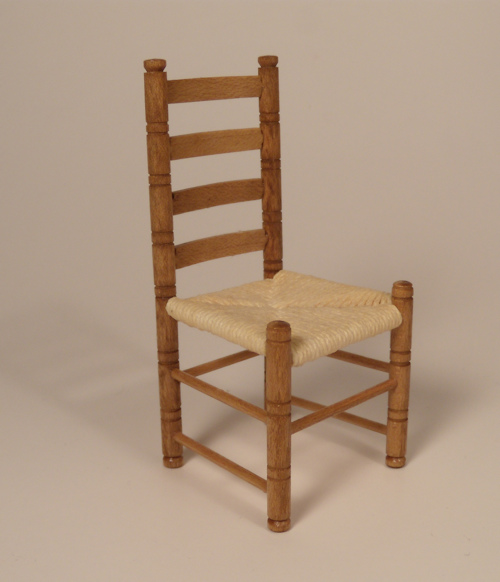 Well made ladder-back maple wood chair with turned legs and sides with 4 curved back rests. The seat is finely woven from stringing and very precise which must have taken a long time to accomplish. Nice smooth finish. Must have been a master craftsman but, unfortunately, there is no signature. c. 1980. Great condition with no breaks or repairs and the woven seat is very clean. 1" scale. The chair is 3 1/2" high.