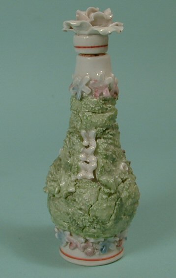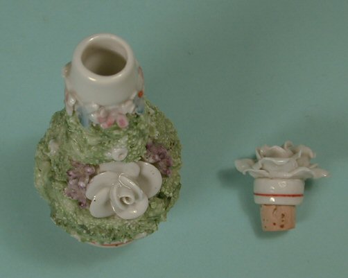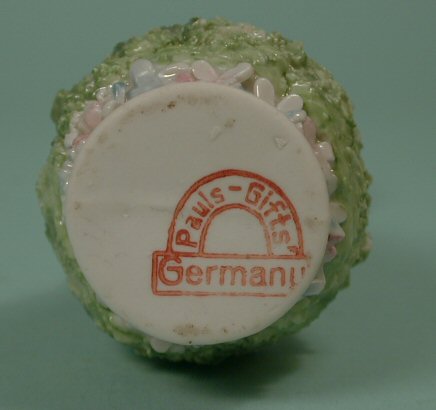 This is a hard-to-find Elfinware perfume bottle with a separate stopper in the form of a rose. Marked Paul's Gifts, Germany, on the bottom. Covered with green moss all around. Very nice condition, perhaps one or two pedals are knicked. Overall height approximately 5". German made c. 1910-15 era.