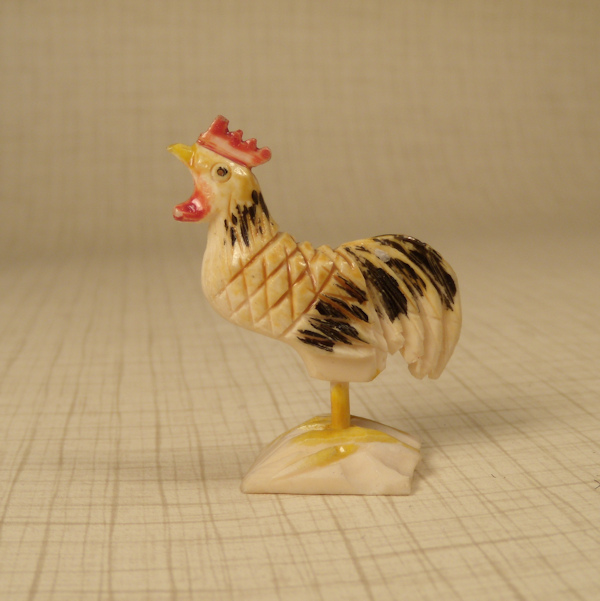 Hand carved and hand painted bone rooster. Very well made and perfect for a dollhouse garden or yard. Colorfully hand painted with yellow beak and feet and red cock's comb. These early bone pieces are getting hard to find. Marked: Made in China at the bottom. c. 1920 period. Overall height which includes the base and top of cock's comb is 1 5/8" h. Great condition.