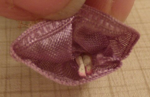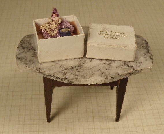 Tiny, all original German peg-wooden doll with painted features, jointed at the neck and legs and wearing her original lavender color silk dress and matching hat and lace apron. She is approximately a tiny 3/4" high. Accompanying her is a dark blue leather book with a tiny wire clasp, with many tiny pages with hand written writing inside, but the writing is too small for me to read, even with a magnifying glass. The cover has a title: Recessional and the next word I cannot make out...it is that tiny. Both are within a tiny old box with imprinted writing: Wilh. Schwarz, Elfenbeinschnitzer, Interlaken. The doll and tiny book sit inside the box on top of very old cotton wool. This grouping came out of an estate in Maine. Rare and so unusual. c. 1885-90 period. The box is 1 1/8" x 1 1/4". All in lovely condition. Perfect as a toy for a dollhouse child; also pictured on top of a marble-top early Germany dollhouse table for size comparison.