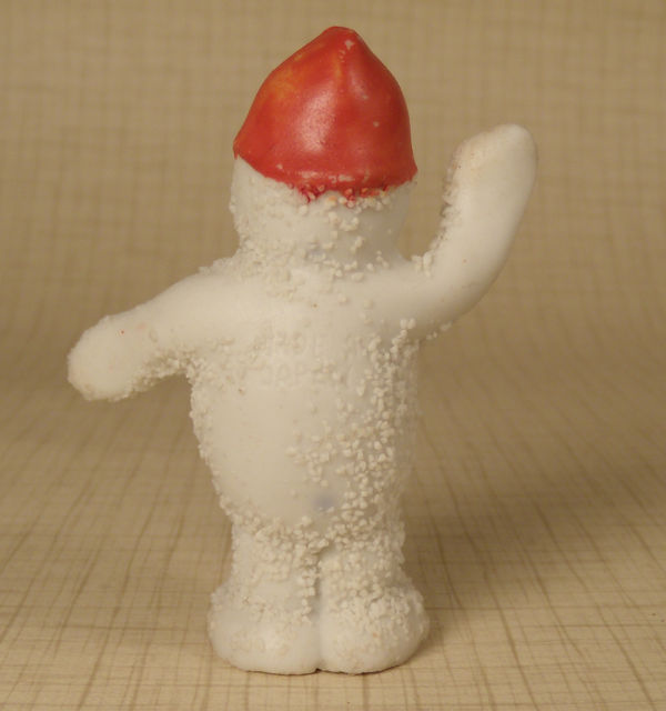 This is the funniest snowman with an interesting hat on his head, which is painted red and his nose and crooked little smile are also painted red. He has one arm up and the other is down. Darling expression on his face. Quite unusual, as one generally does not find a snowman with grout or "snow." There is a bit of grout loss, mostly on his back. No breaks or repairs. Made in Germany, c. 1915. 2 3/4" high.