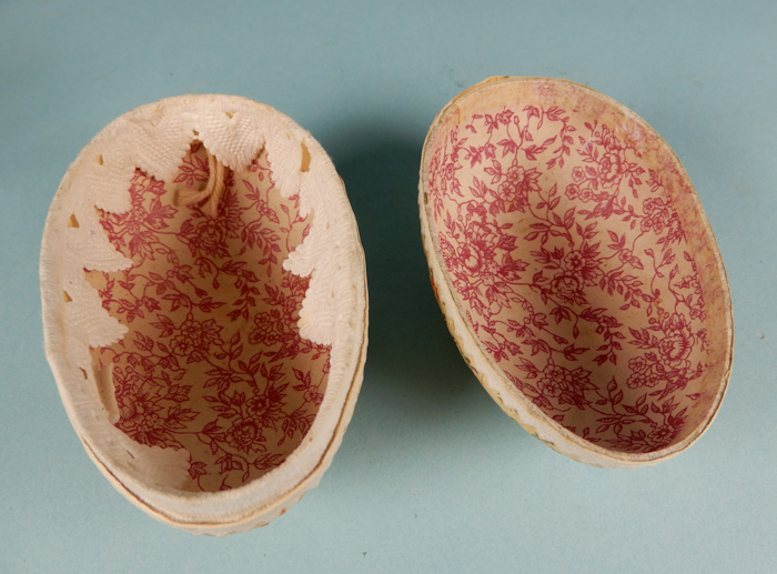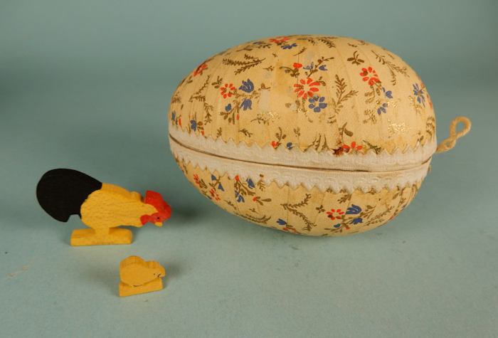 Beautifully made papier mache goose covered with a lovely imprinted paper of red and blue flowers with gold leaves and vines. The interior is another imprinted paper pattern of dark pink flowers, leaves and vines. The edges of the egg has white embossed Dresden paper on the outside and the inside of the bottom piece also has lovely embossed white paper in a point design. Also has a string loop. This held candy at one time. It is the size of a goose egg 2 1/2" high, and 3 1/8" long. Marked "Made in Germany." Lovely overall condition. Tiny bit of wear on the bottom where it touches the surface of where it is placed. This is a lovely piece, especially at Easter time for decorating. Also pictured with two wooden chickens (which are sold separately under Antique Dollhouse Miniatures and Accessories).