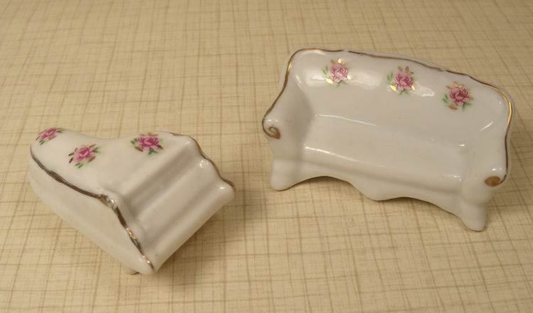 Very attractive, small matching set of a white porcelain sofa and piano with pink roses and outlined with gold gilding. This set is 1/2" scale and would be perfect in a nursery for toys for dolls. The sofa is 2 1/4" long and 1" high. The piano is 1 3/4" long and 1" high. German made. c. 1920, no markings.