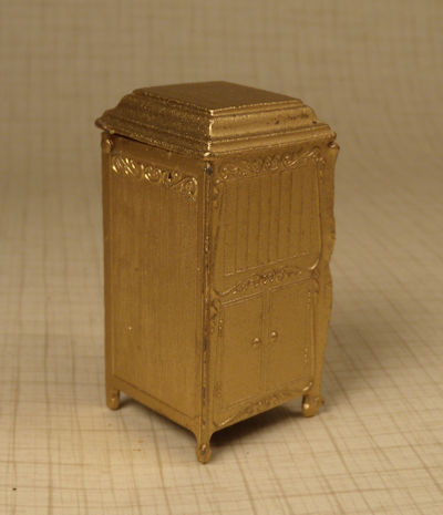 Beautiful Tootsietoy record player enameled in gold. Top opens up as shown. 2 1/8" high. c. 1930. Beautiful condition with no breaks.
