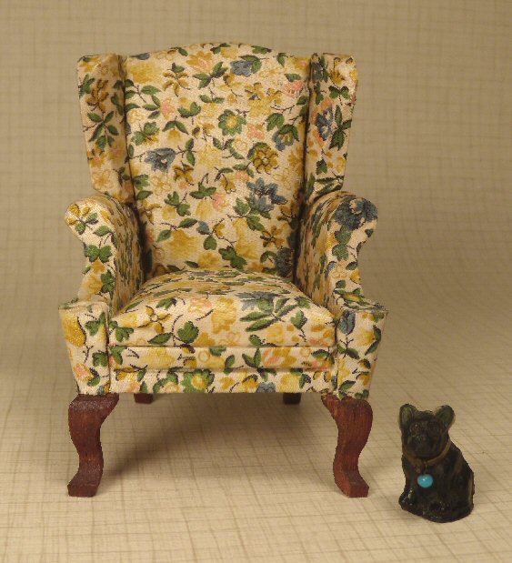 Darling miniature solid glass Boston Terrier made in Czechoslovakia, c. 1920-25 era. The color is deep green, which is quite unusual for this type of animal figure, and this can be very easily seen when he is held up to the light. He wears a brass collar which is marked: Czechoslovakia....I needed a magnifier to see this as the lettering is quite small. He also has a contrasting aqua glass bead attached to his collar. Sweet little dog, great for a dog collector or in a dollhouse setting. He is 7/8" high, great condition with no breaks. Pictured with a 1" scale Lynnfield Queen Anne wing chair which is sold separately.