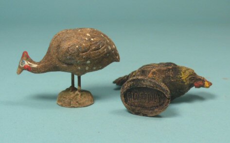 This pair of two composition fowl are being sold together. One is a rooster and the other is a peahen. The rooster is marked Elastolin on the bottom, I cannot see a mark on the bottom of the peahen, although they are made from the same composition-type material and have very similar bases. Height of rooster at the highest point of his tail is 2 1/2" and the peahen is 1 5/8" at his back. Nice condition showing some age wear. Made in Germany, c. 1920.