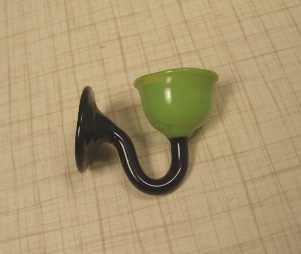Great looking glass scounce, black base and arm, with a wonderful green glass shade, all one piece. German made blown glass, from the famous glass blowing Lauscha area. c.1910-20. Wonderful condition. 1" high, 1" wide. Needs a little sticky wax to attach to wall. Would make a stunning addition to an early dollhouse or a Tynietoy dollhouse.